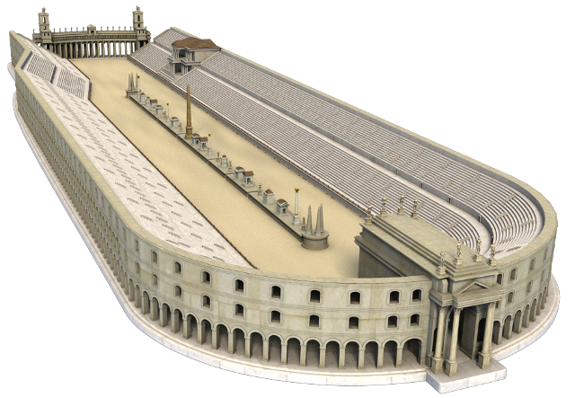 والمضمارات الرومانية كانت شبيهة بهذه الصورة المجسّدة لـ Circus Maximus في إيطاليا. وكانت تعرف عند الإغريق باسم بـ: هيپّودروموس أو Hippodrome بالإنجليزية وتعني سباق الخيل (مركبة من hippos خيل وdromos سباق).